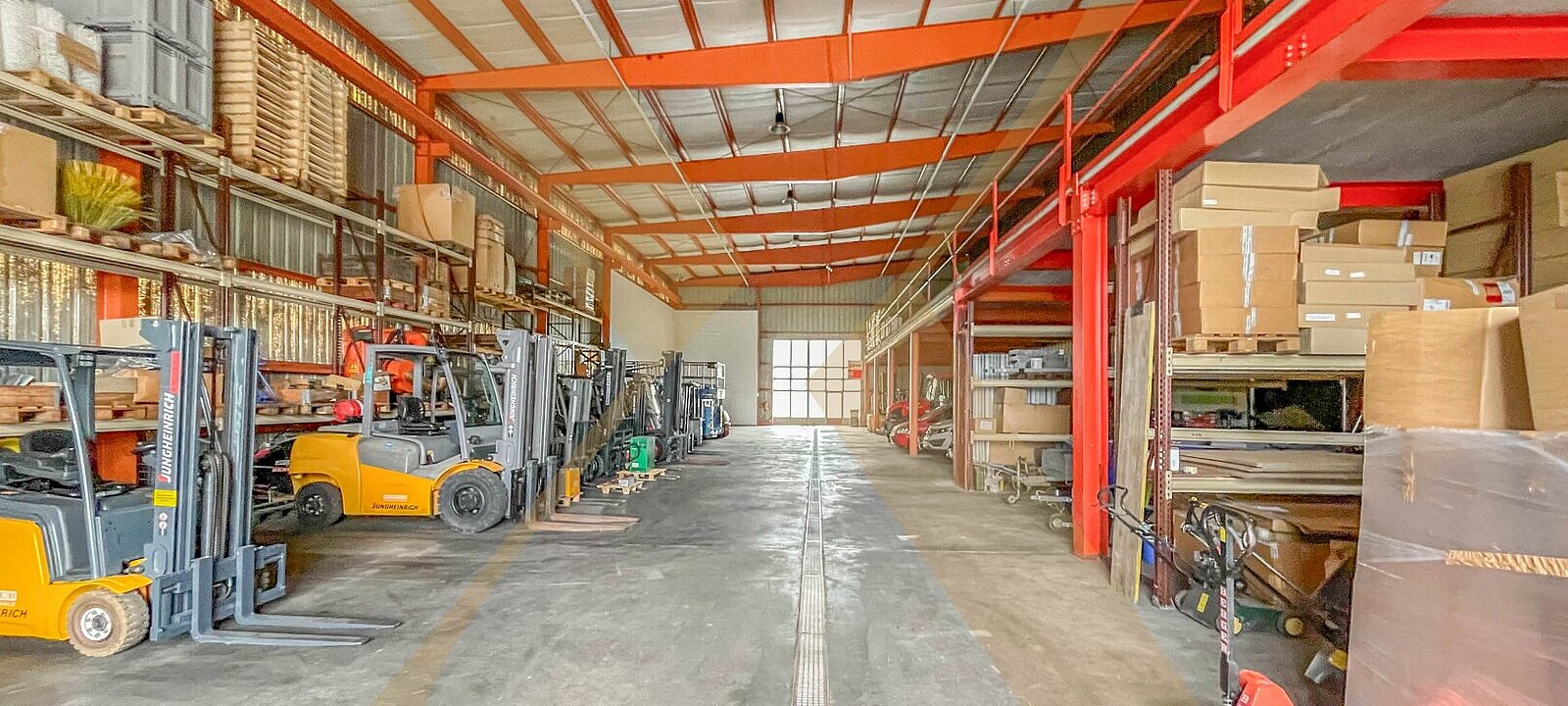 Diese Lagerfläche verfügt über ca. 2.340m² und ist sowohl mit Hallenkränen (bis zu 5t Traglast), als auch mit 4 ebenerdigen Rolltoren, alle davon ca. 5m hoch und ca. 5m breit, ausgestattet.