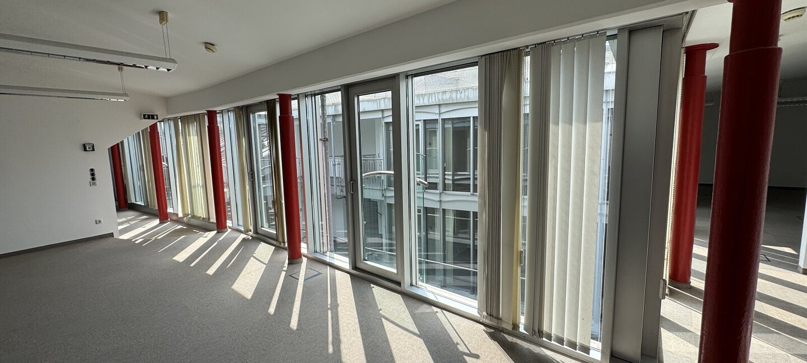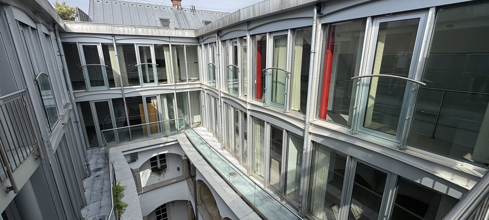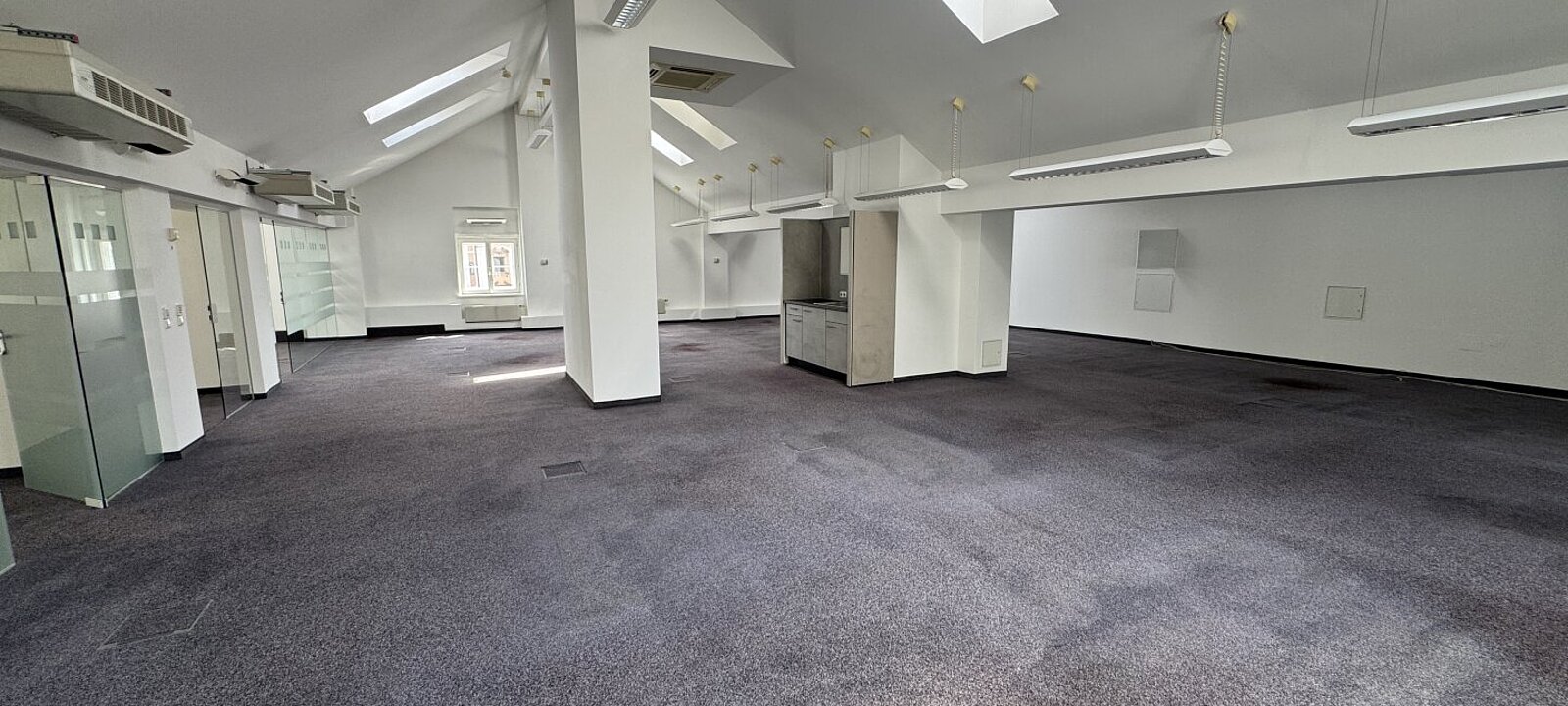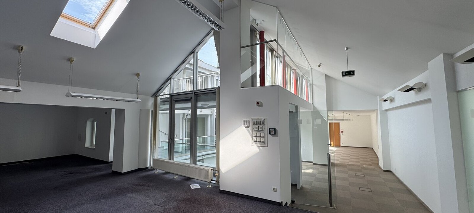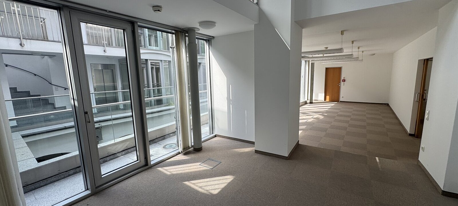 Von beiden Ebenen kommt man in den wunderschönen belichteten Innenhof ins Freie. Aktuell sind rund 16 Räume abgetrennt, die Flächen sind veränderbar.