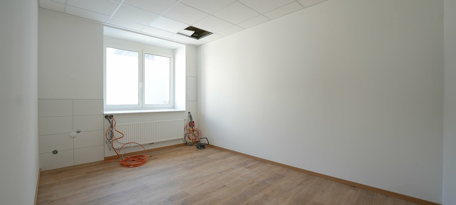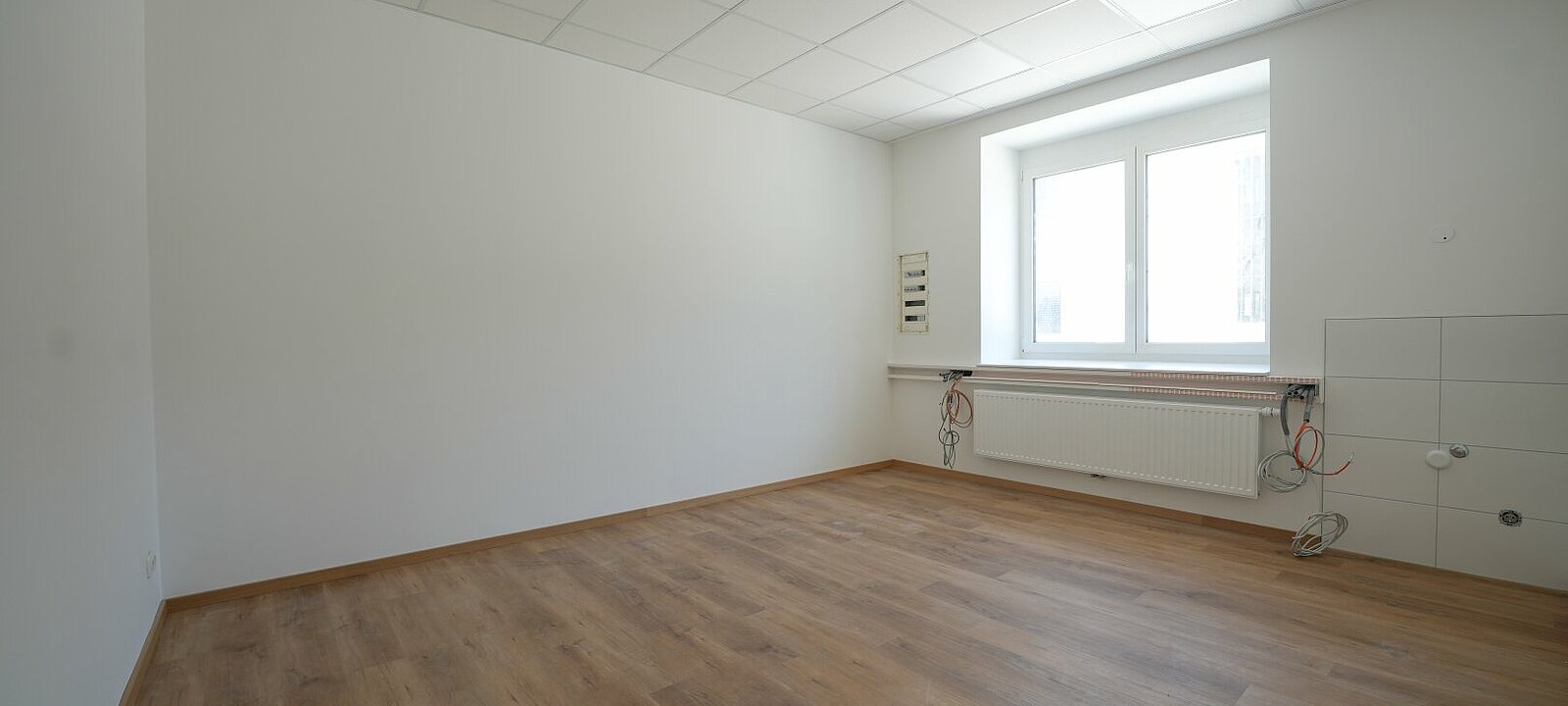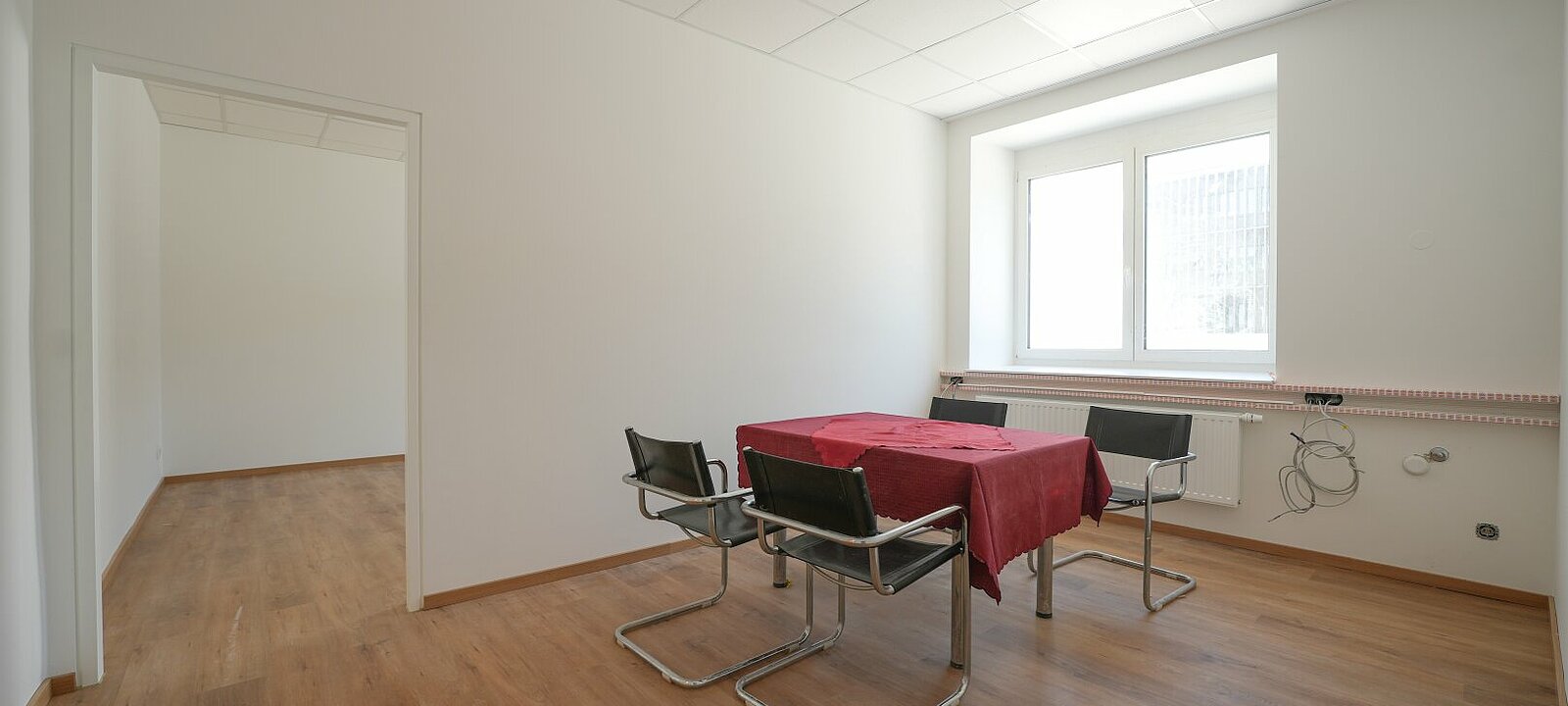 Helle und freundliche Räume erwarten Sie, ausgestattet mit einem hochwertigen Vinylboden, der sowohl Funktionalität als auch ein ansprechendes Ambiente bietet. Die massiven Wände garantieren nicht nur Stabilität, sondern auch eine angenehme Akustik, die für konzentriertes Arbeiten unerlässlich ist. Die großen, öffenbaren Fenster sorgen für eine optimale Belüftung und lassen viel Tageslicht herein, was eine einladende Atmosphäre schafft.