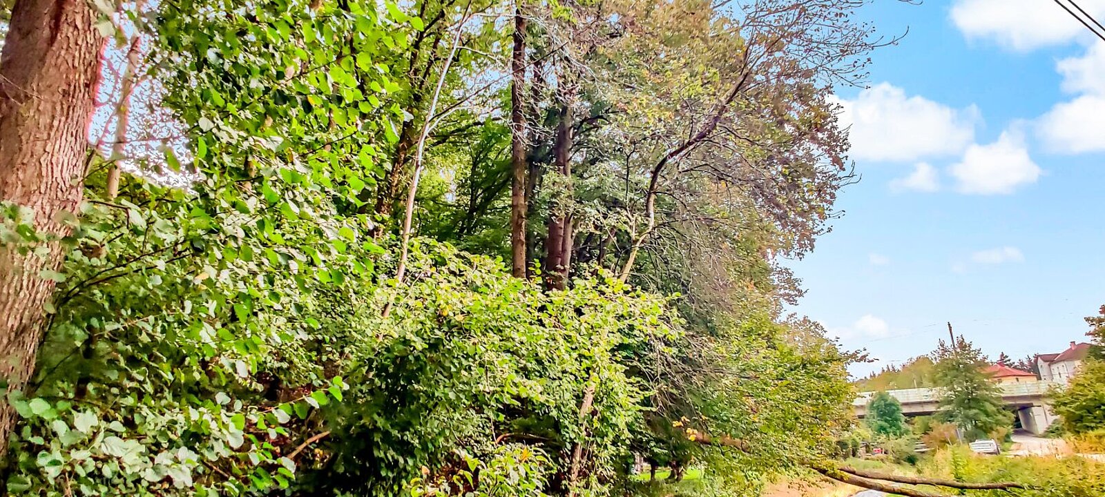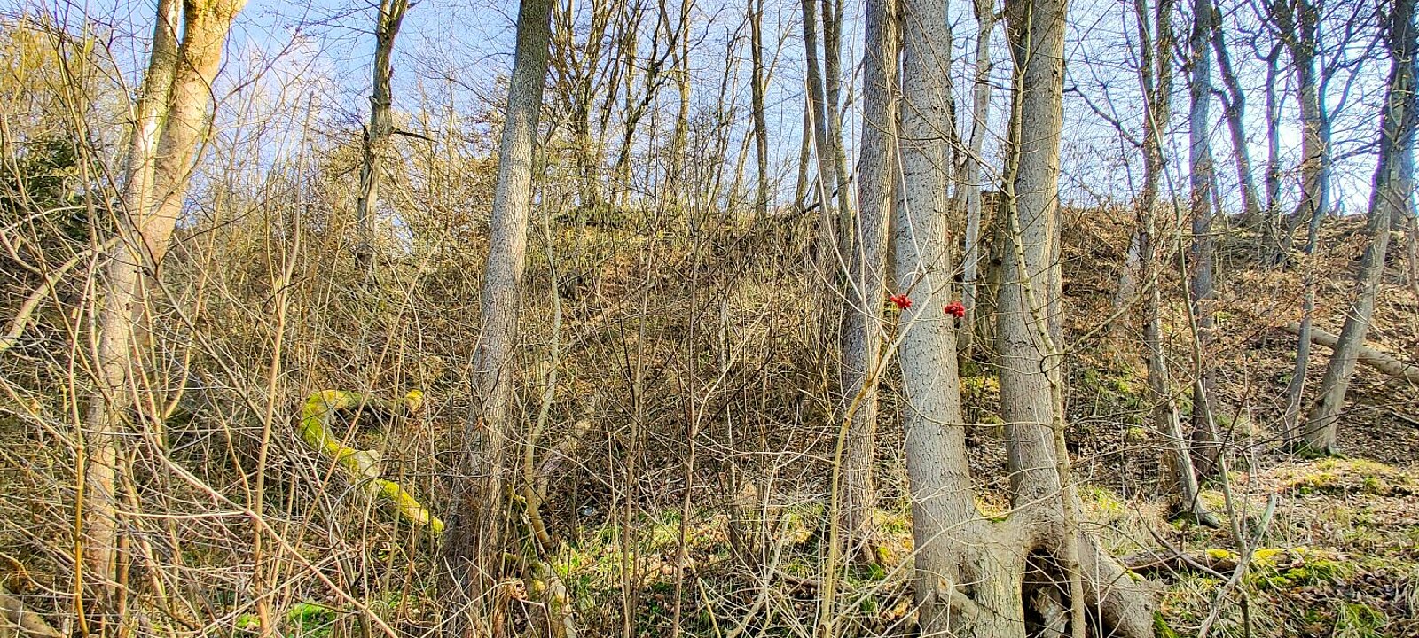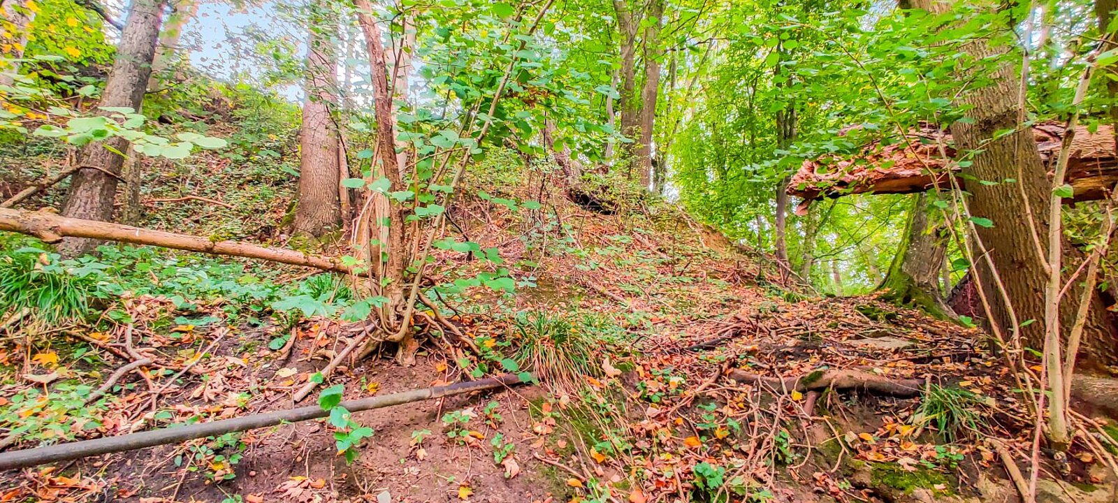* Bestand an Hochwald mit Buchen, Eichen und Fichten (ca. 50–80 Jahre alt).