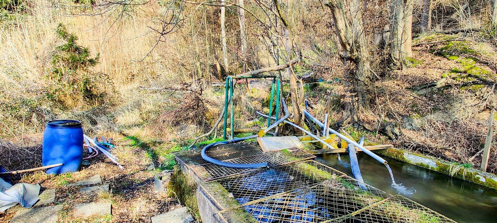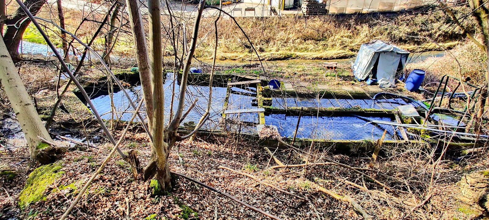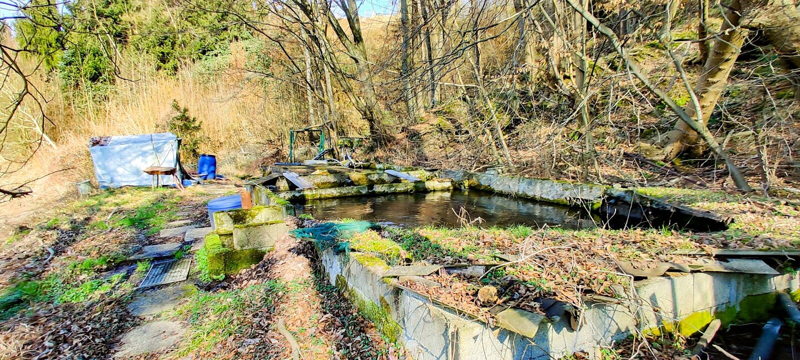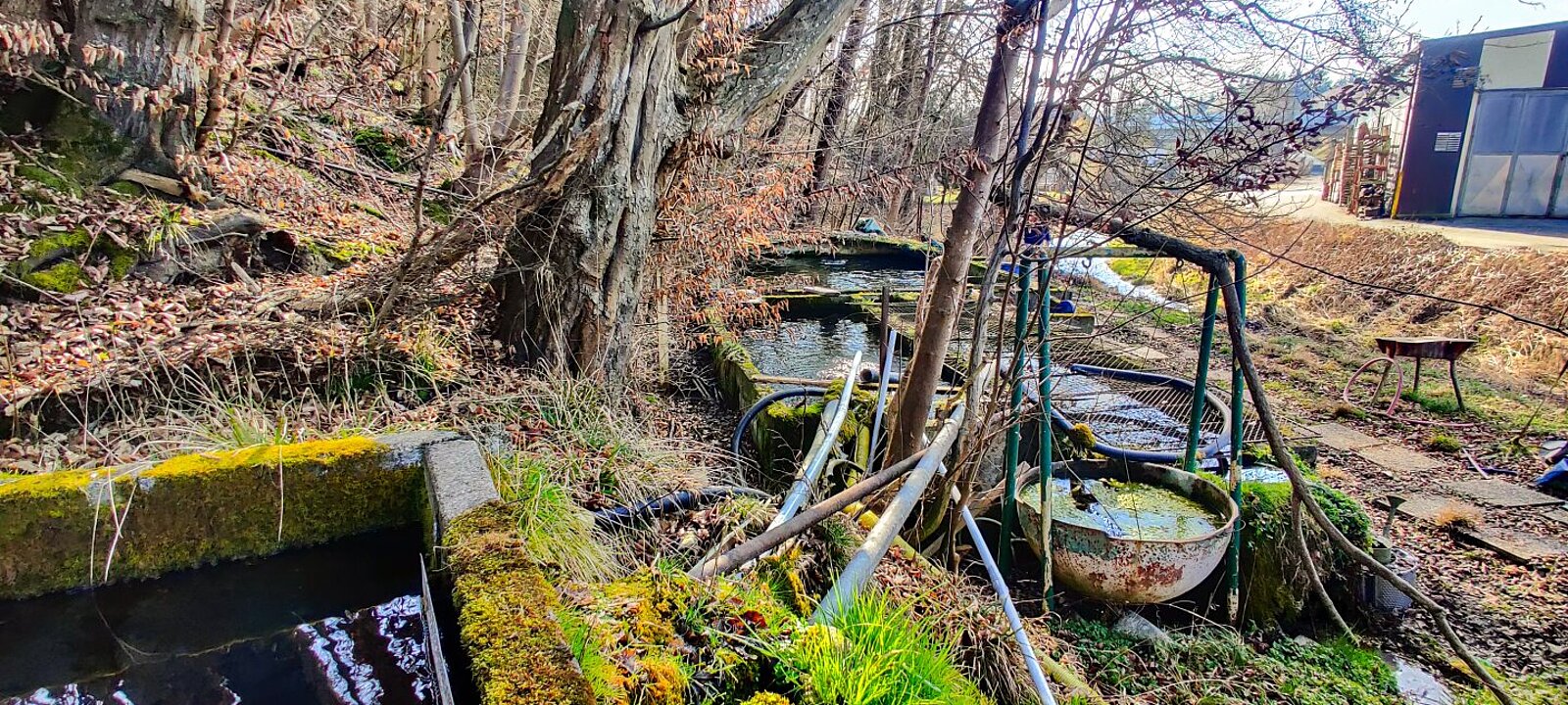 Direkt angrenzend liegen Freilandflächen mit Wald- und Grünbestand sowie eine bewirtschaftete Fischzucht. Diese ist derzeit verpachtet und wird über eine gefasste Quelle versorgt, die zusätzlich ein Haus sowie ein Nachbargrundstück mit Wasser beliefert.