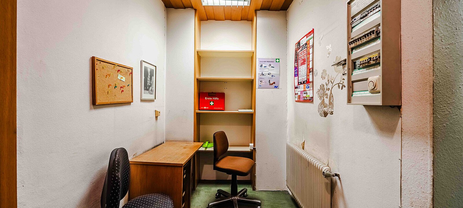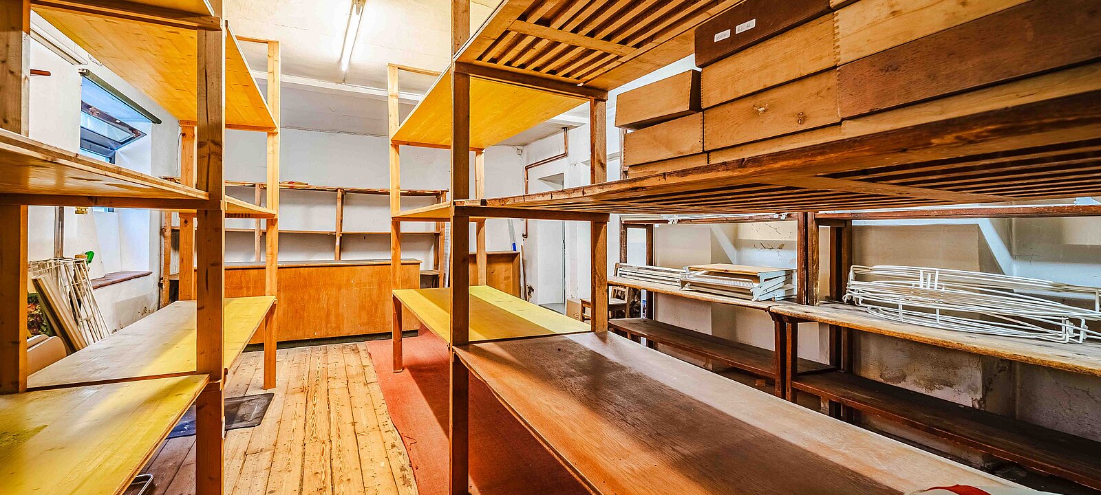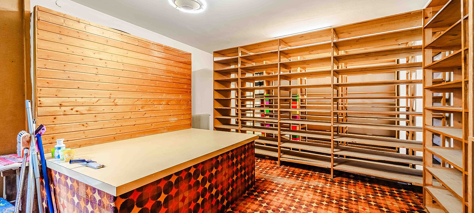 Im linken Bereich führt ein Zugang in ein separates Büro mit angeschlossener Mitarbeitergarderobe – perfekt für administrative Tätigkeiten in unmittelbarer Nähe zum Verkaufsbereich. Der rückwärtige Teil des Lokals beherbergt ein praktisches Lager samt WC. Hier stehen Ihnen noch bestehende Holzregale und ein Packtisch zur Verfügung – ideal für Lagerung und Versand.