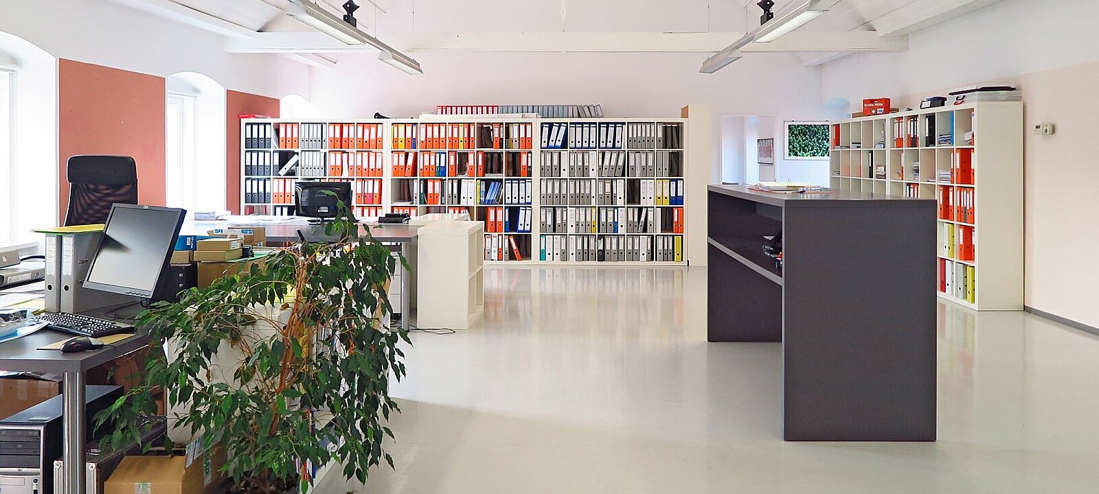 Ein helles imposantes Großraumbüro mit einer Raumhöhe von bis zu 4,60m bietet ausreichend Platz für einen einladenden Empfangsbereich, weitere inspirierende Arbeitsplätze für Ihre Mitarbeiter sowie großzügige Schränke für Akten und Ordner.