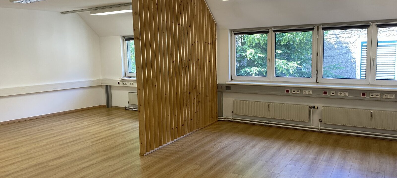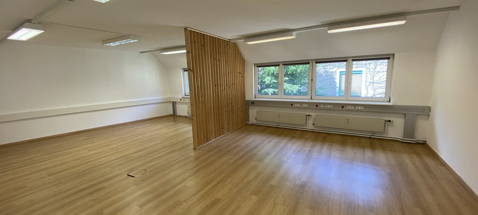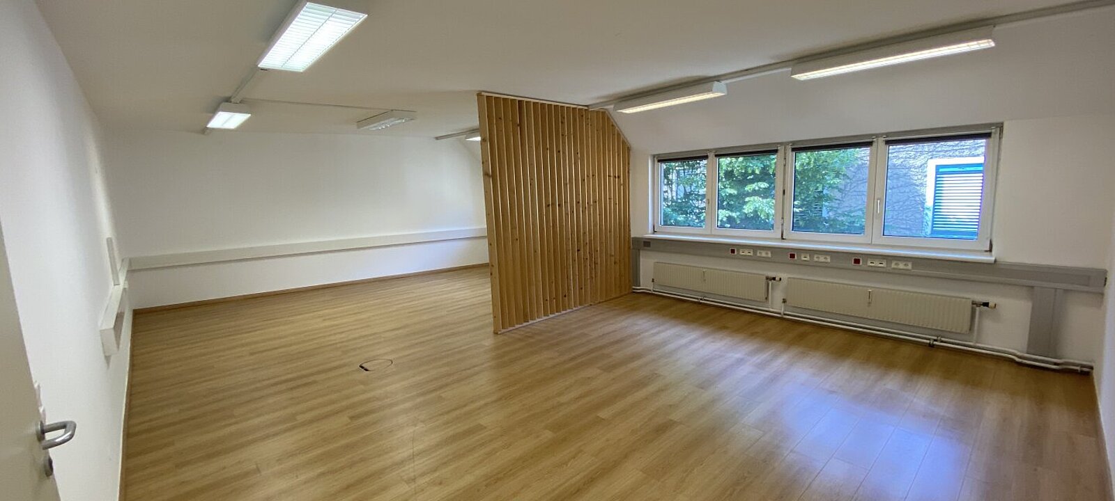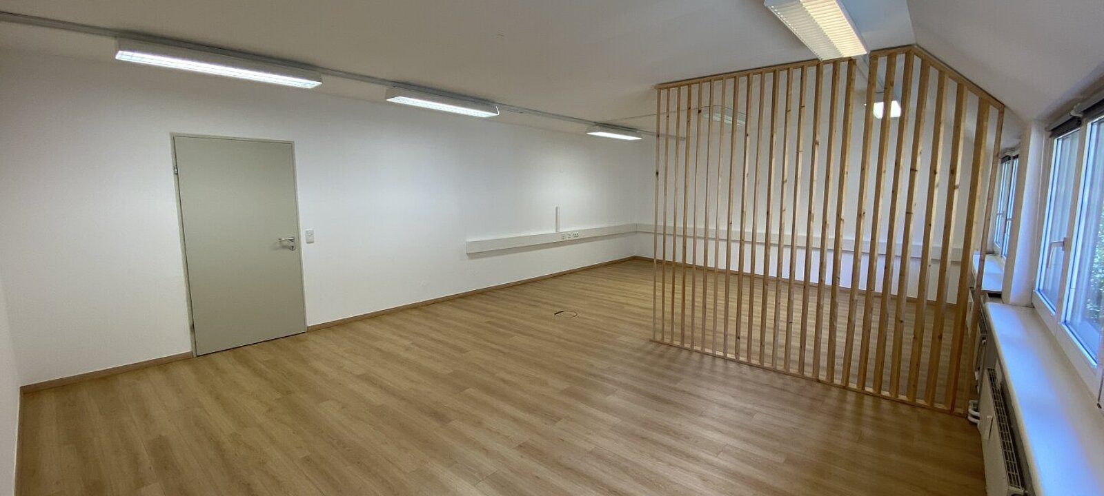 Ihre Zufriedenheit und Komfort ist uns sehr wichtig - sämtliche Büros werden vor der Übergabe exklusiv für unsere Kunden saniert und im Zuge dessen mit unserem hochwertigen und modernen Laminatboden in der Farbe Grau mit Holzstruktur ausgestattet.