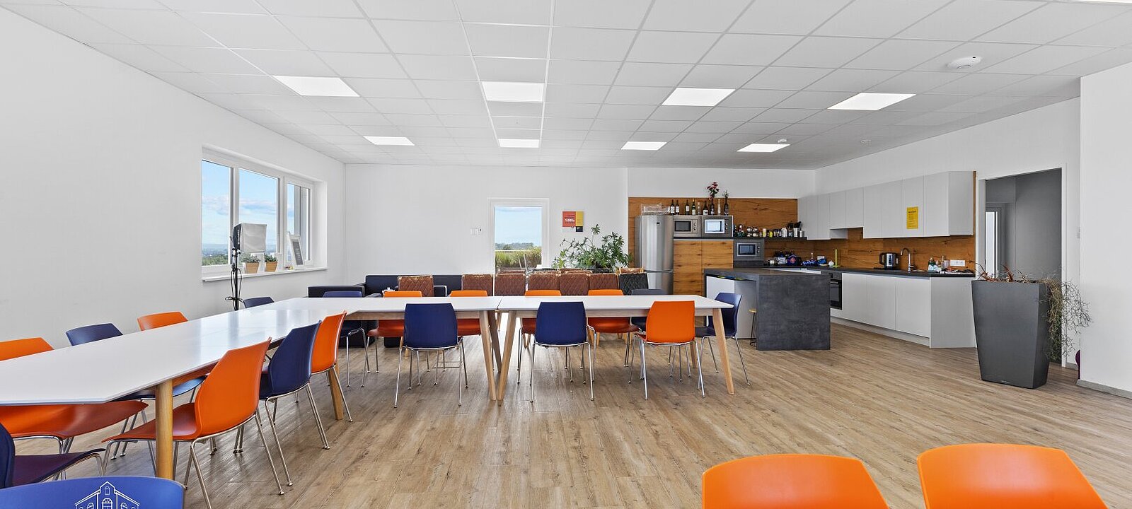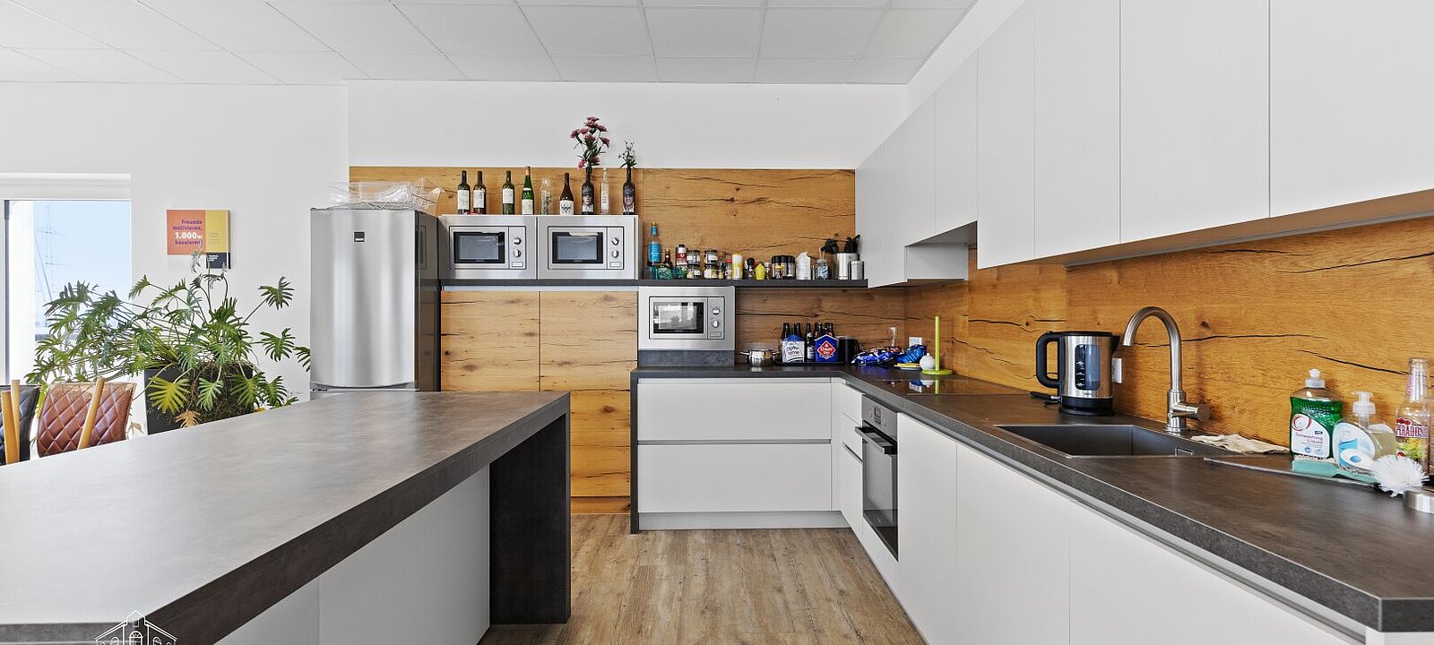 Ein besonderes Highlight ist die 36 m² große Dachterrasse – ein Ort zum Auftanken, für kreative Pausen oder Meetings im Freien. Ergänzt wird das Angebot durch moderne Küchen auf mehreren Ebenen, einladende Empfangsbereiche sowie Lagerflächen für effiziente Abläufe.