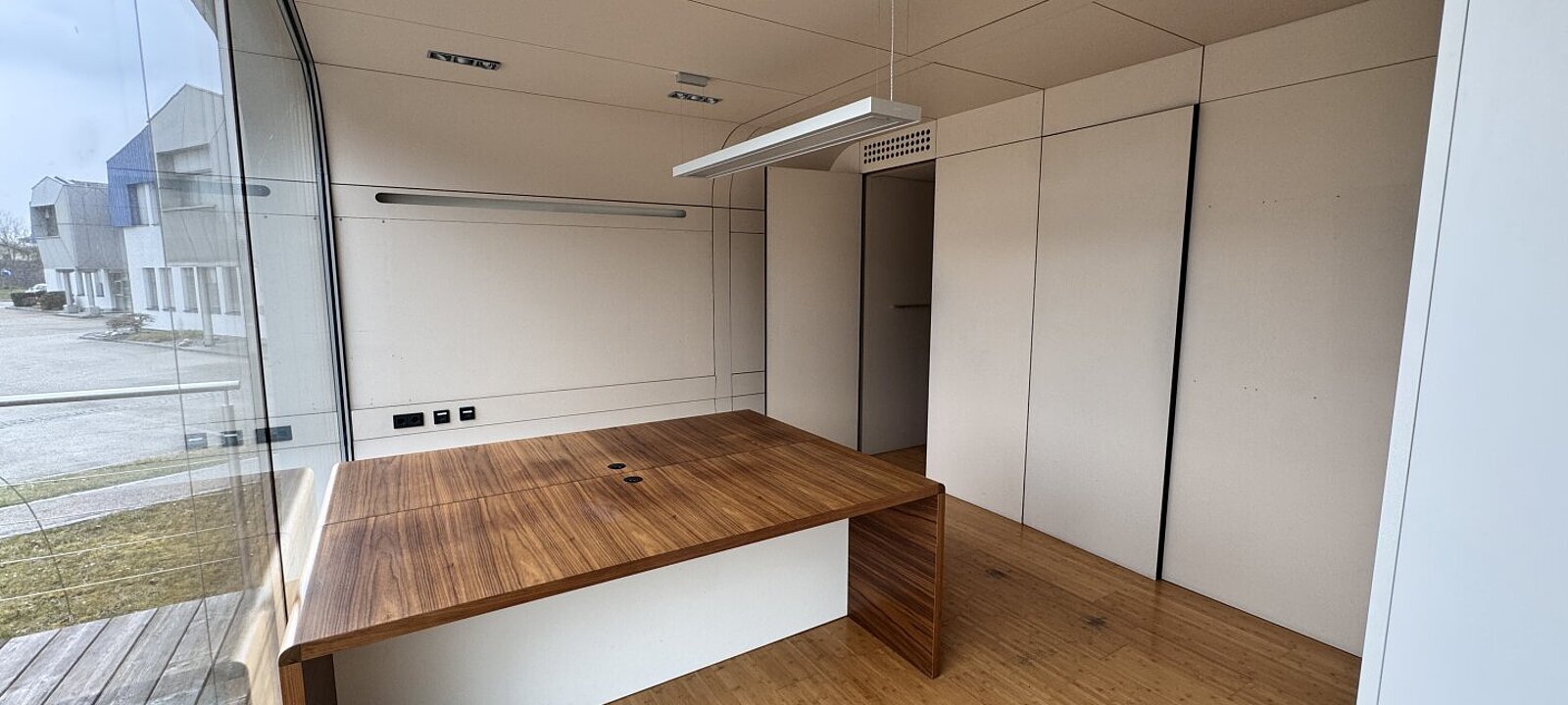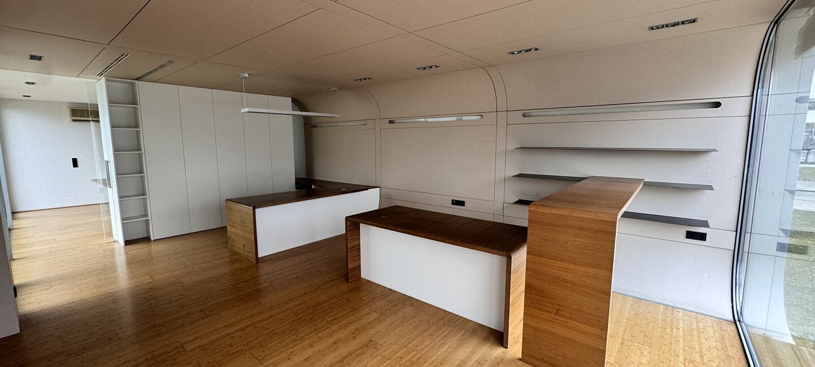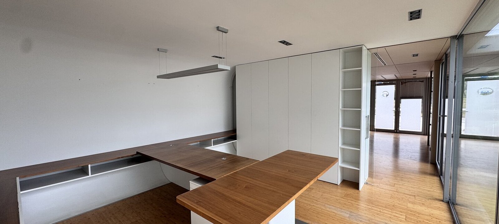 Das Büro ist mit hochwertigen Holzböden ausgestattet, die dem Raum eine warme und elegante Note verleihen. Der Raum ist möbliert und bietet Schreibtische sowie Schränke, die für eine schnelle und unkomplizierte Nutzung sorgen. Diese Ausstattung eignet sich hervorragend für Einzelbüros, Beratungsräume oder als Open-Space für kreative Tätigkeiten.