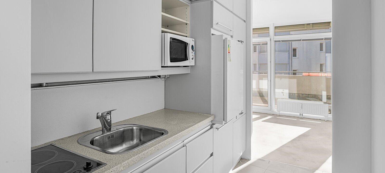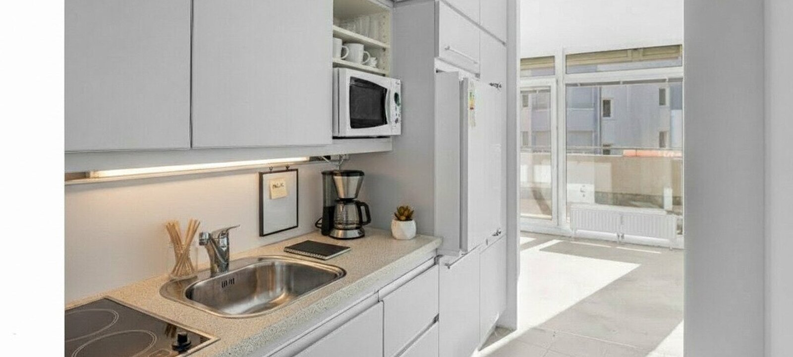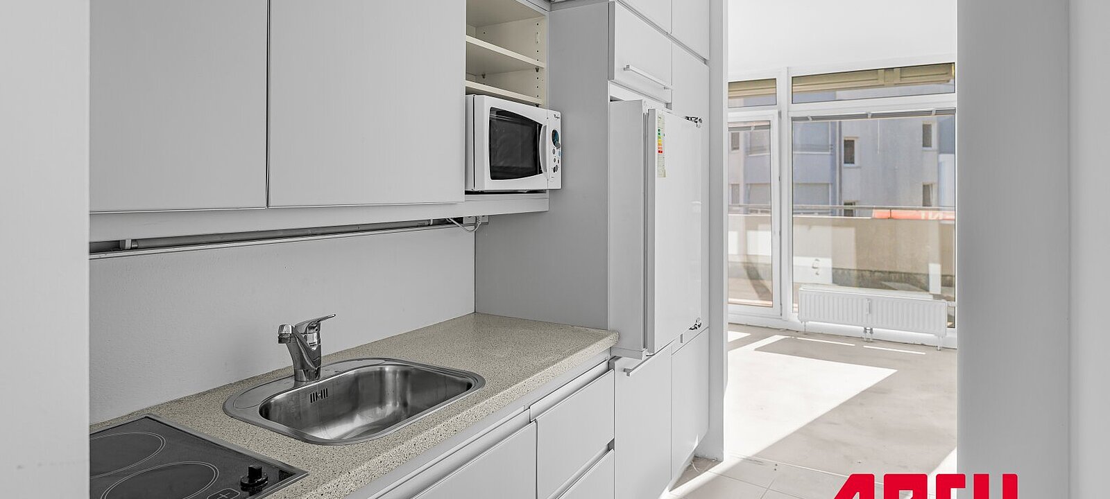 Die moderne Einbauküche lädt dazu ein, Pausen in einer angenehmen Atmosphäre zu verbringen, während der Personenaufzug den Zugang zum Bürokomfort für alle Mitarbeiter und Kunden erleichtert.