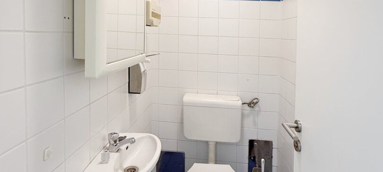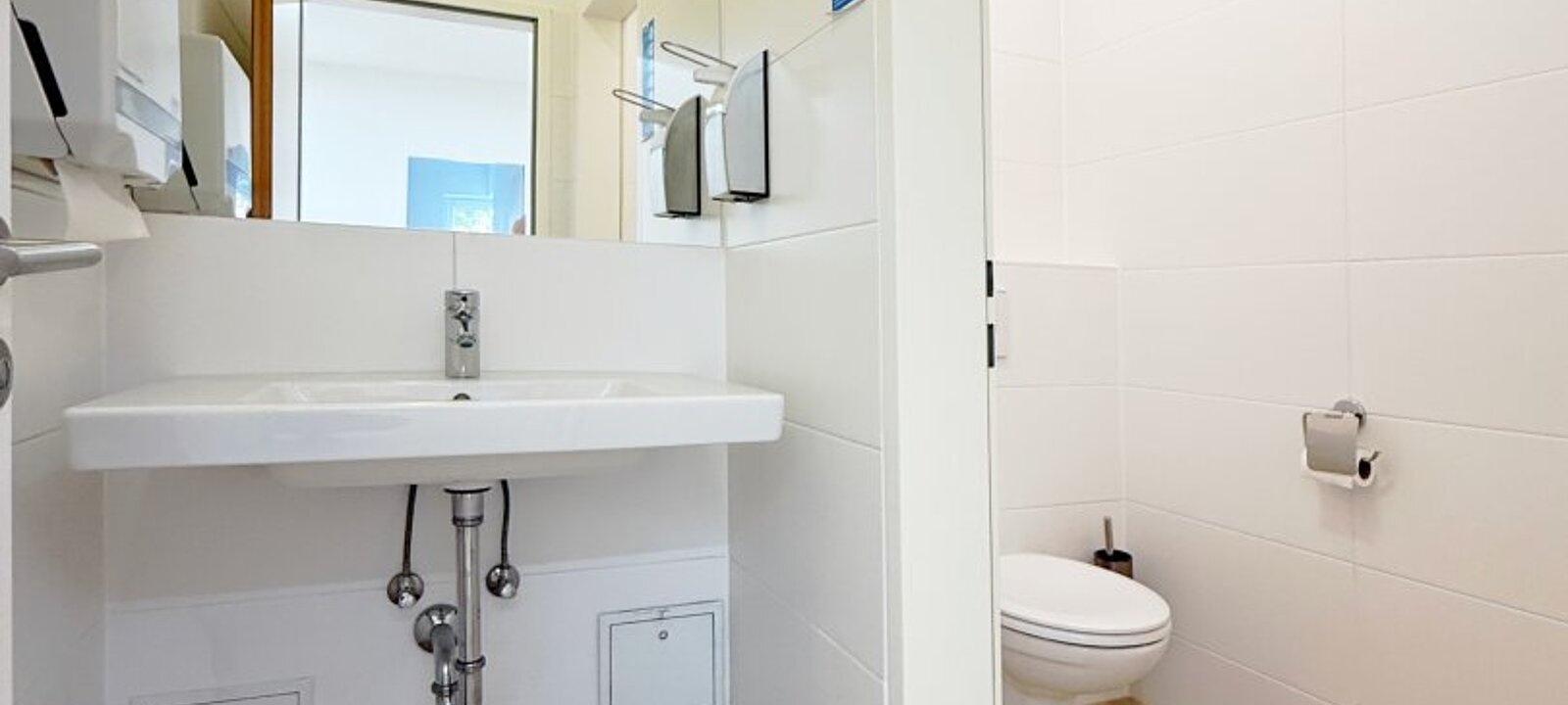 Die Praxis liegt im 1. Obergeschoss und ist mit einem Personenaufzug erreichbar, allerdings nicht ganz barrierefrei, da dieser Lift im Halbstock startet.