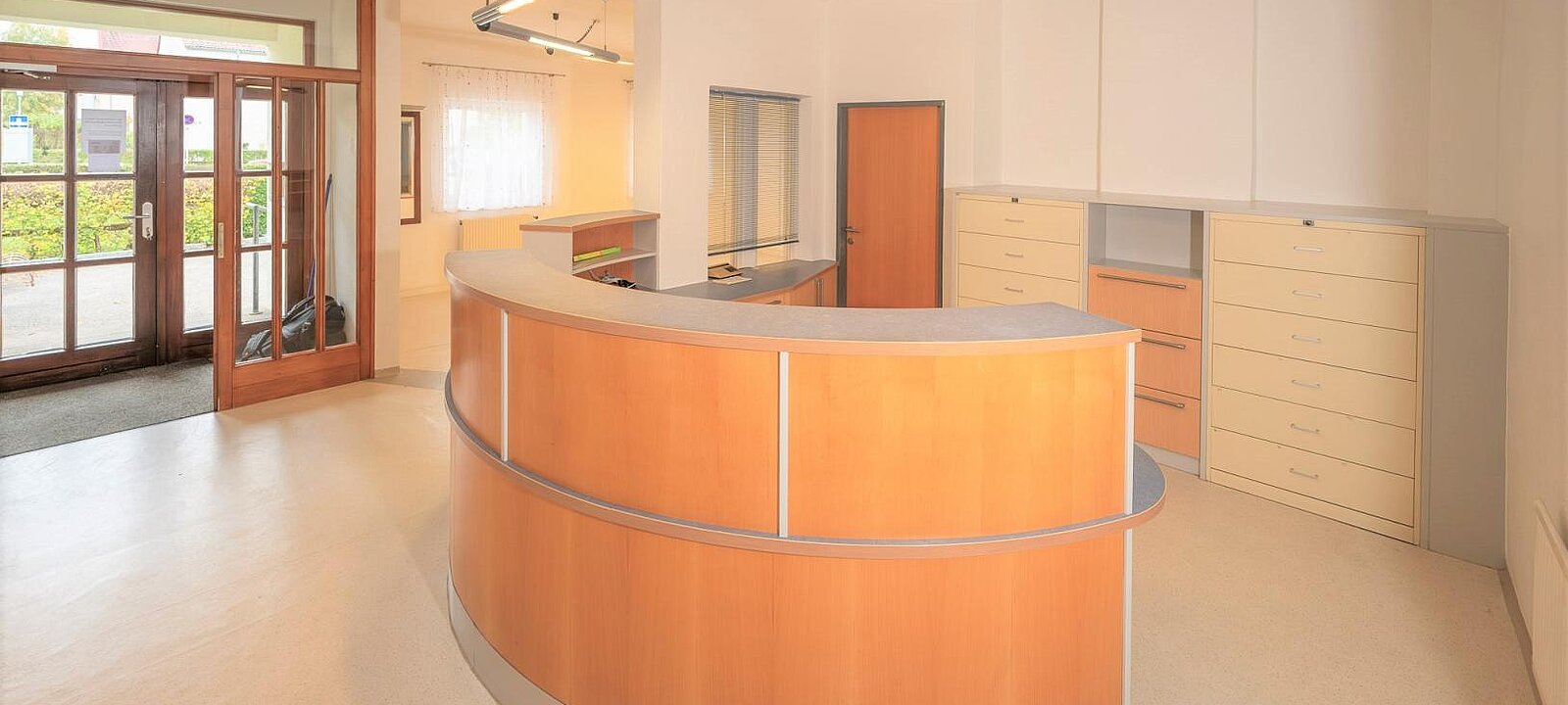 Der Zugang ist ebenerdig und das Objekt bequem über den Windfang von der Straße und den Parkplätzen aus zu erreichen, also ideal für eine Arztpraxis.