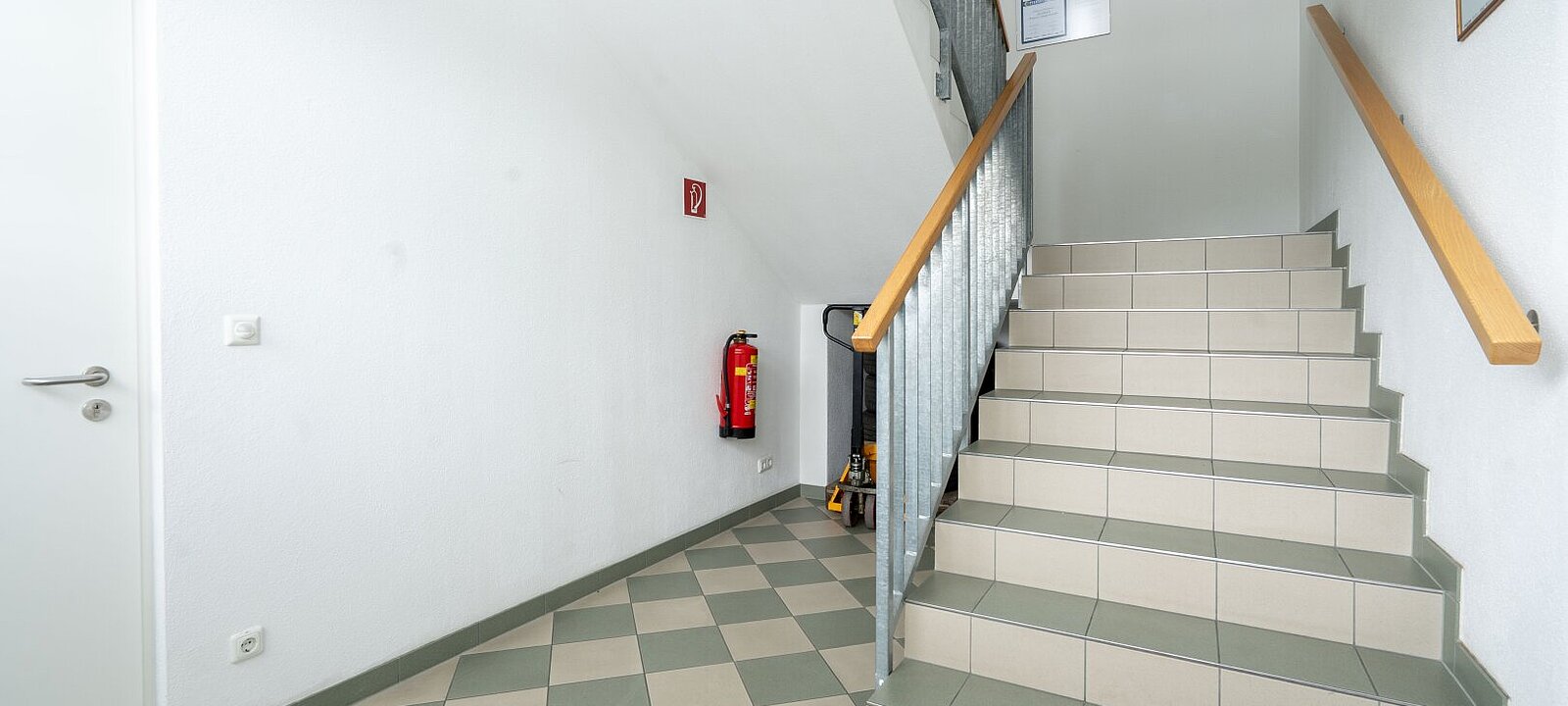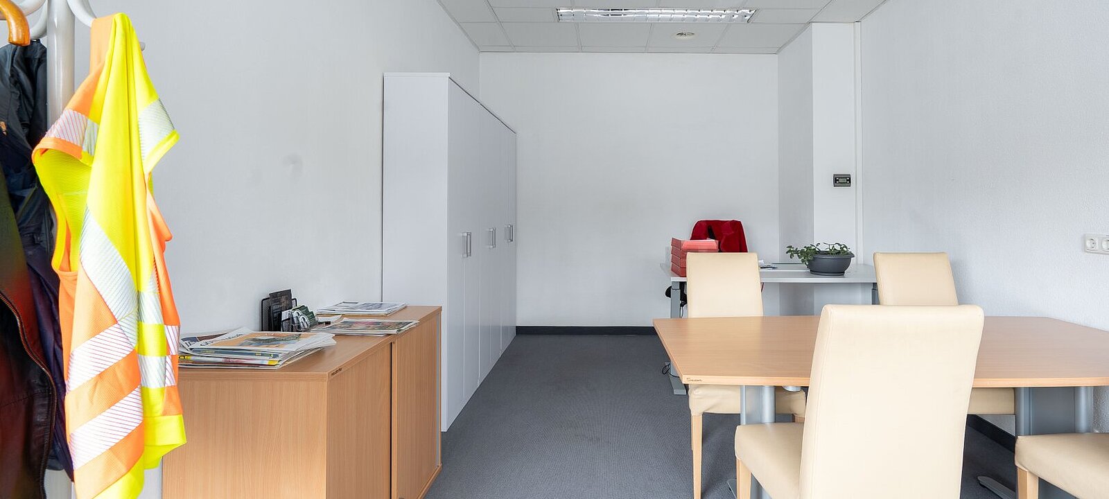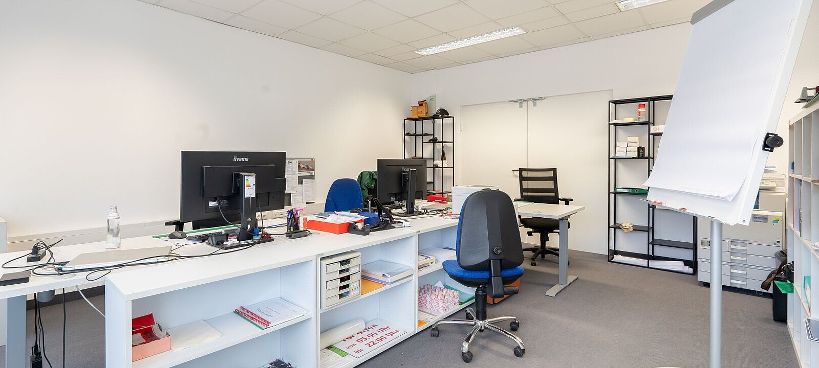 Das Büro im Erdgeschoss ist hell und funktional geschnitten und kann optimal für Verwaltung, Empfang oder Kundenkontakt genutzt werden. Das Obergeschoss-Büro überzeugt durch einen großzügigen Schnitt und die integrierte Küche, die als Pausen- oder Besprechungsbereich dient und den Arbeitsalltag komfortabel gestaltet. Sanitäre Einrichtungen für Damen und Herren befinden sich in der Gewerbehalle und stehen den Mietern beider Büros zur Verfügung.