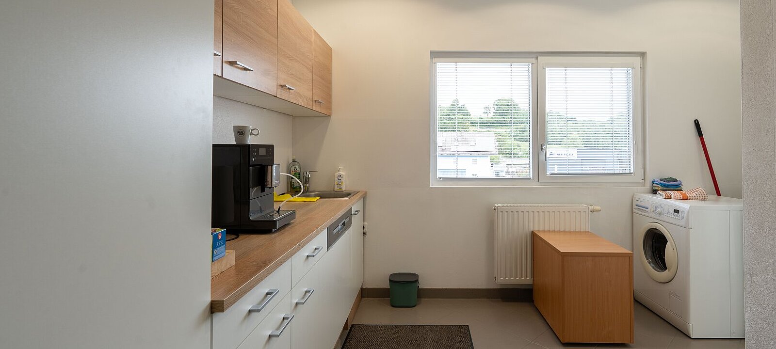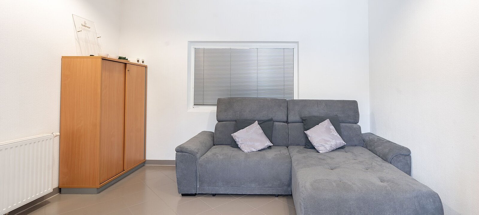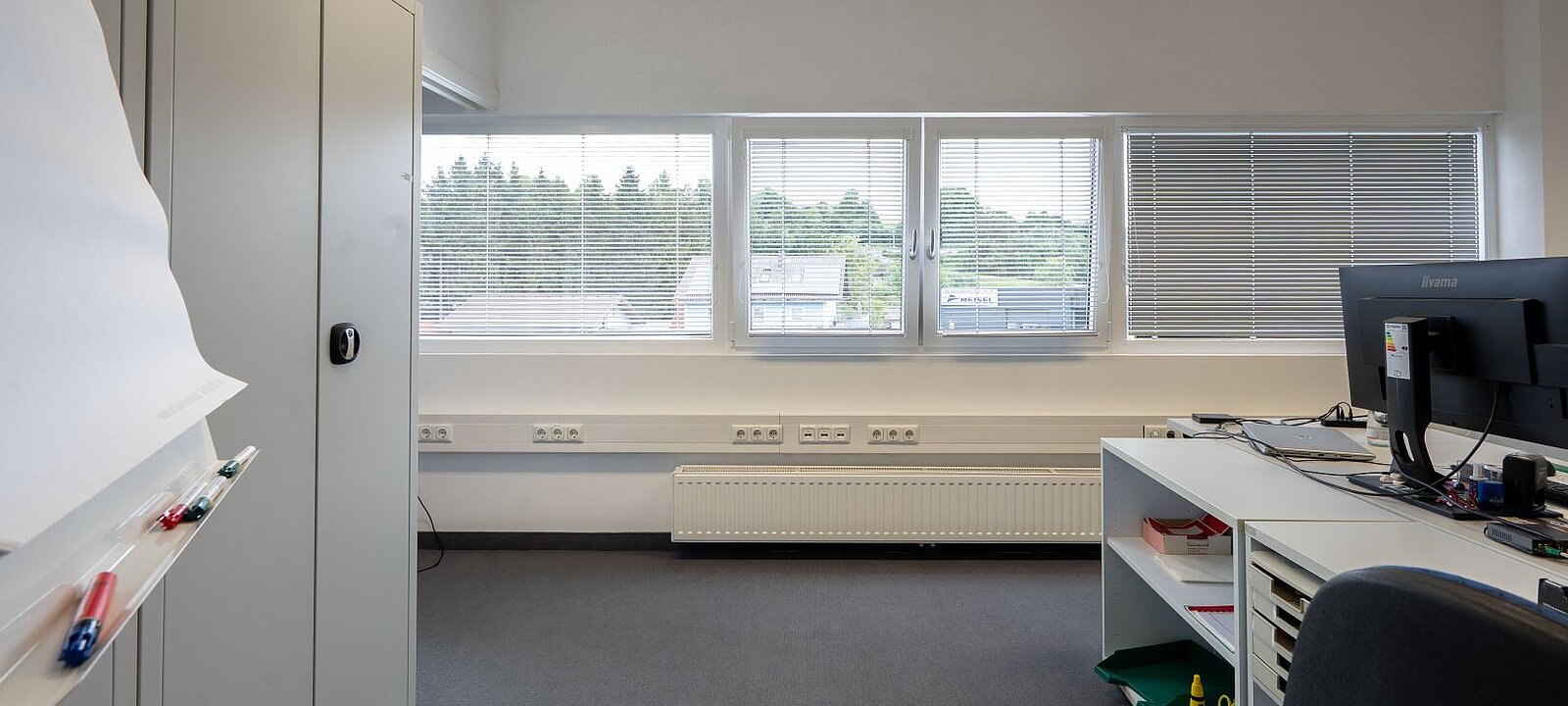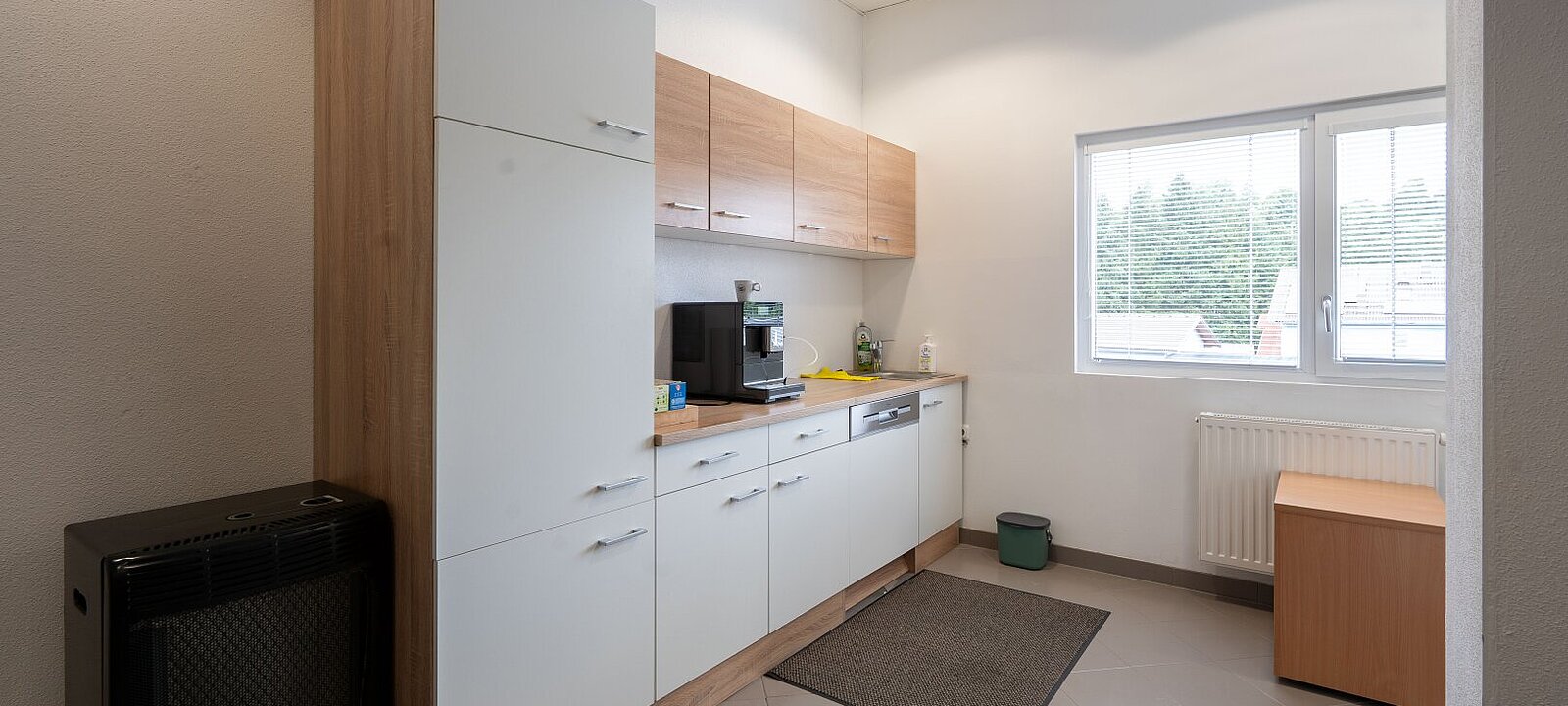 Das Büro im Erdgeschoss ist hell und funktional geschnitten und kann optimal für Verwaltung, Empfang oder Kundenkontakt genutzt werden. Das Obergeschoss-Büro überzeugt durch einen großzügigen Schnitt und die integrierte Küche, die als Pausen- oder Besprechungsbereich dient und den Arbeitsalltag komfortabel gestaltet. Sanitäre Einrichtungen für Damen und Herren befinden sich in der Gewerbehalle und stehen den Mietern beider Büros zur Verfügung.
