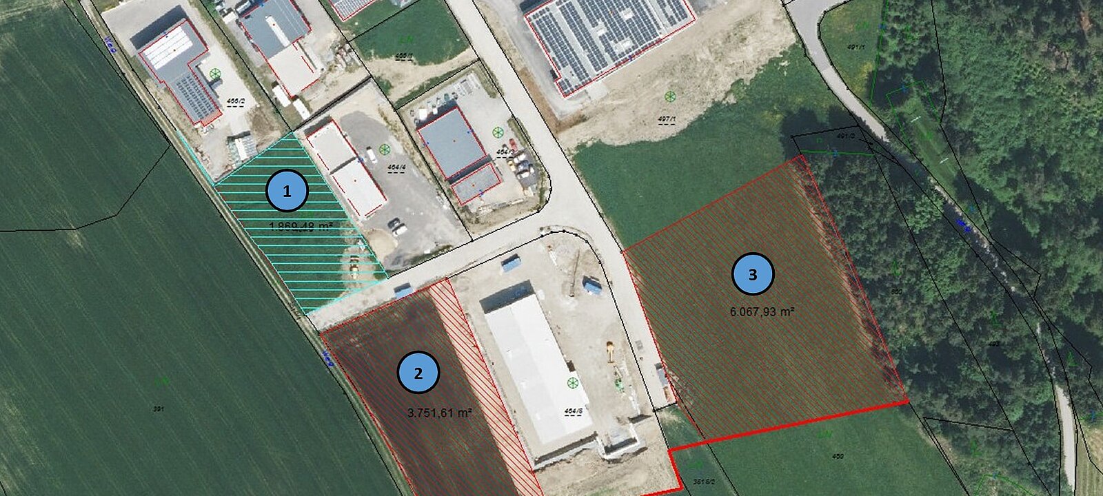 Bei Grundstück 3 ist entlang des Waldes eine ca. 2000m2 große Schutzzone (im FWP schraffiert dargestellt) gewidmet, darauf können Park- und Lagerflächen errichtet werden. Hauptgebäude sind im oberen Bereich zur Straße zu situieren. Leicht abschüssiges Gelände. Höhenbeschränkung hinsichtlich Nähe zum Flugplatz Hirschbach sind zu beachten.