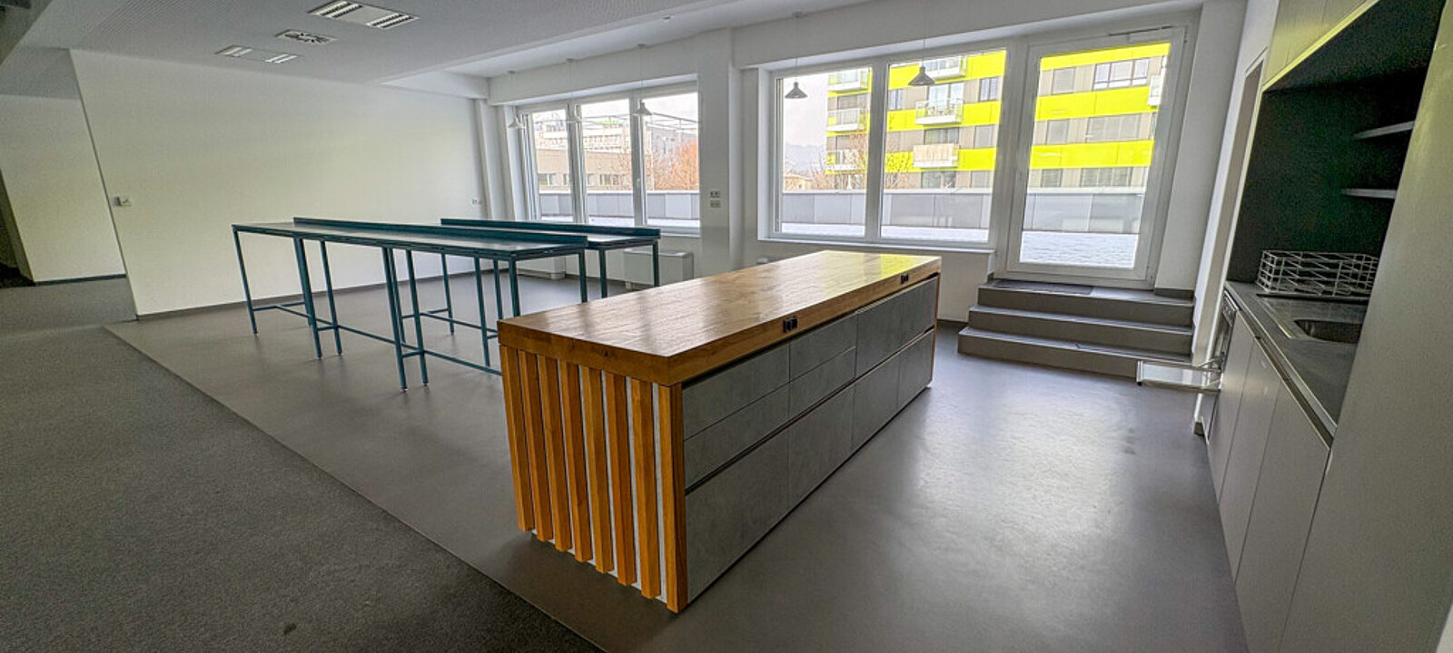 Die Mieteinheit im 2. Obergeschoss ist bequem über einen Personen- und Lastenlift sowie das Treppenhaus erreichbar. Die moderne Struktur der Fläche bietet Einzelbüros, Großraumbüros, Besprechungsräume und Begegnungszonen. Ein besonderes Highlight ist die 135 m² große Terrasse, die das Büroerlebnis perfekt abrundet (Mietpreis EUR 5,00/m² zzgl. Steuern).