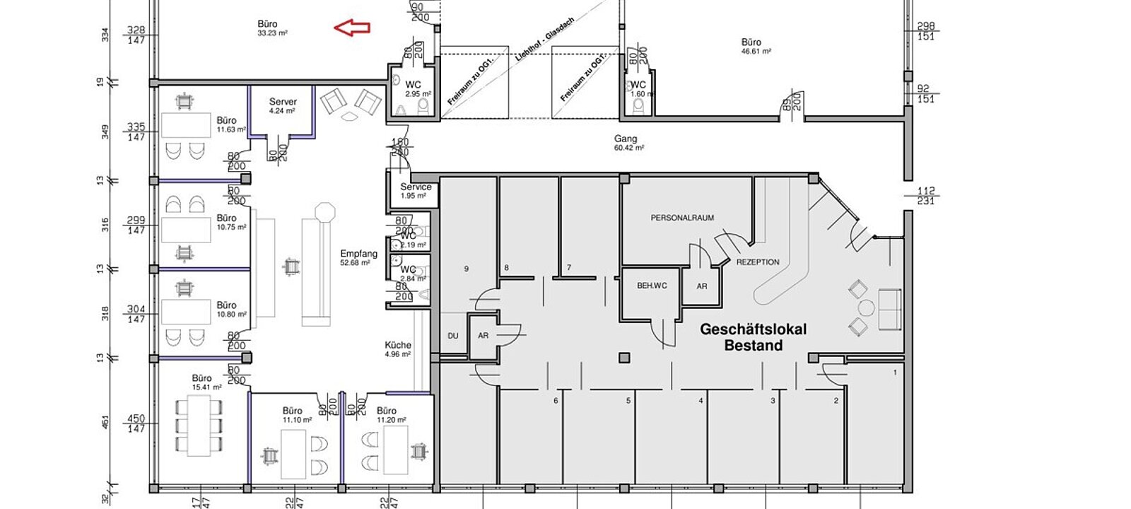 Ein besonderer Vorteil dieser Einheit ist die flexible Raumgestaltung: Die bestehende Raumaufteilung kann nach den individuellen Wünschen und Anforderungen des neuen Mieters angepasst werden und bietet somit vielseitige Nutzungsmöglichkeiten.