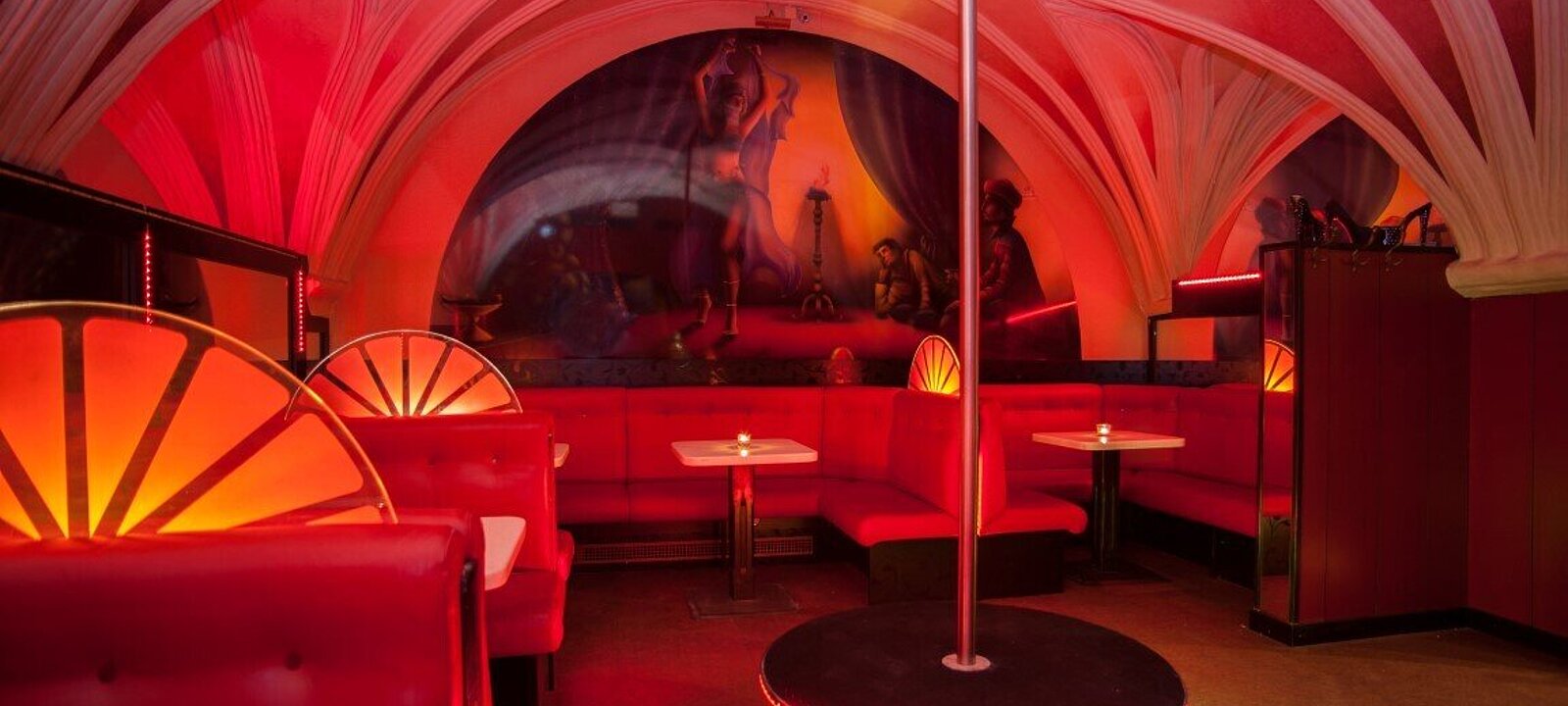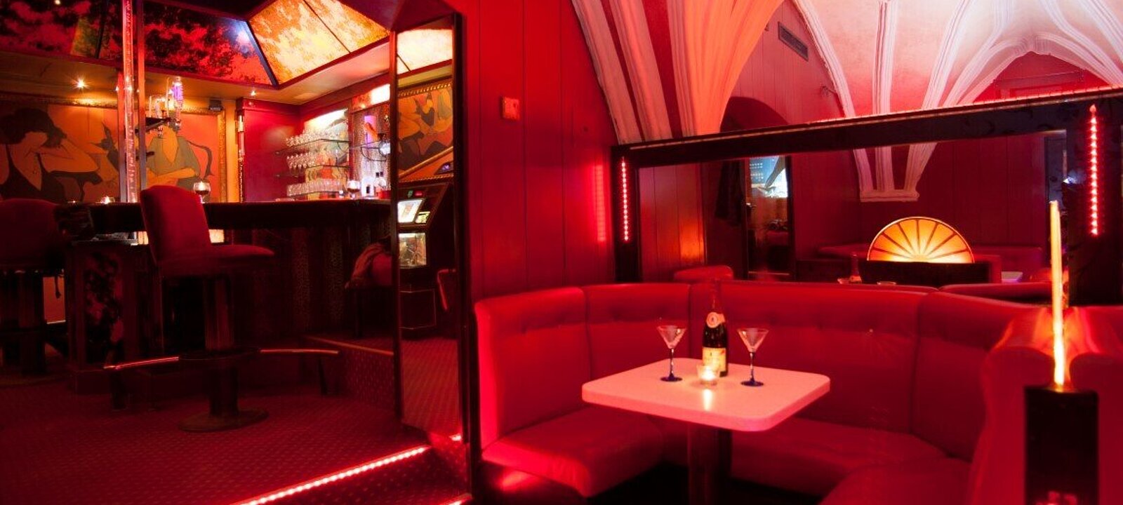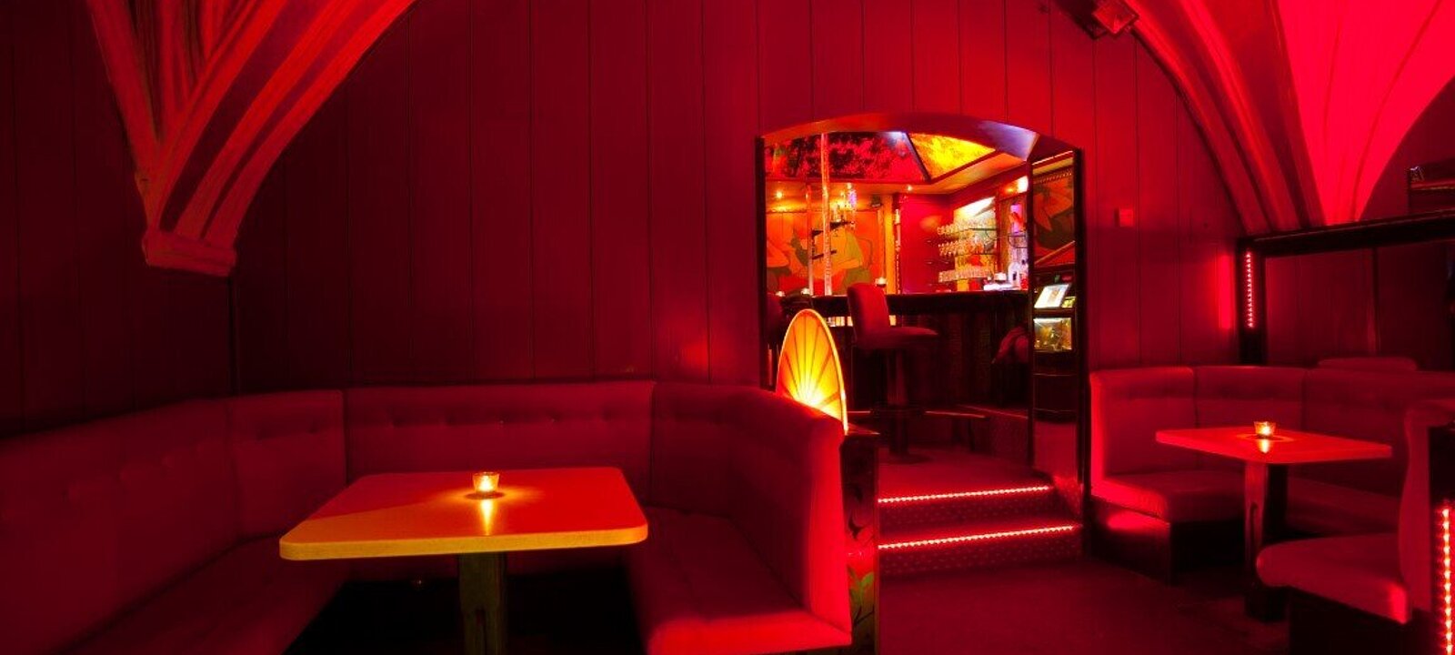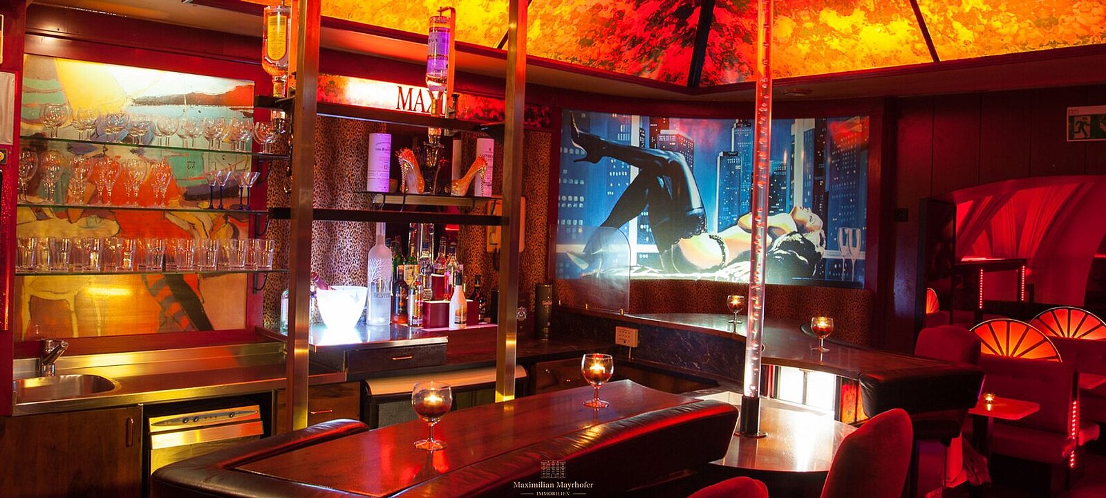 Der großzügige Barbereich im Erdgeschoss begeistert mit seiner voll ausgestatteten Theke, der eindrucksvollen Animierstange und dem imposanten Kreuzgewölbe – ein Ambiente, das Gäste wie Betreiber gleichermaßen in seinen Bann zieht.