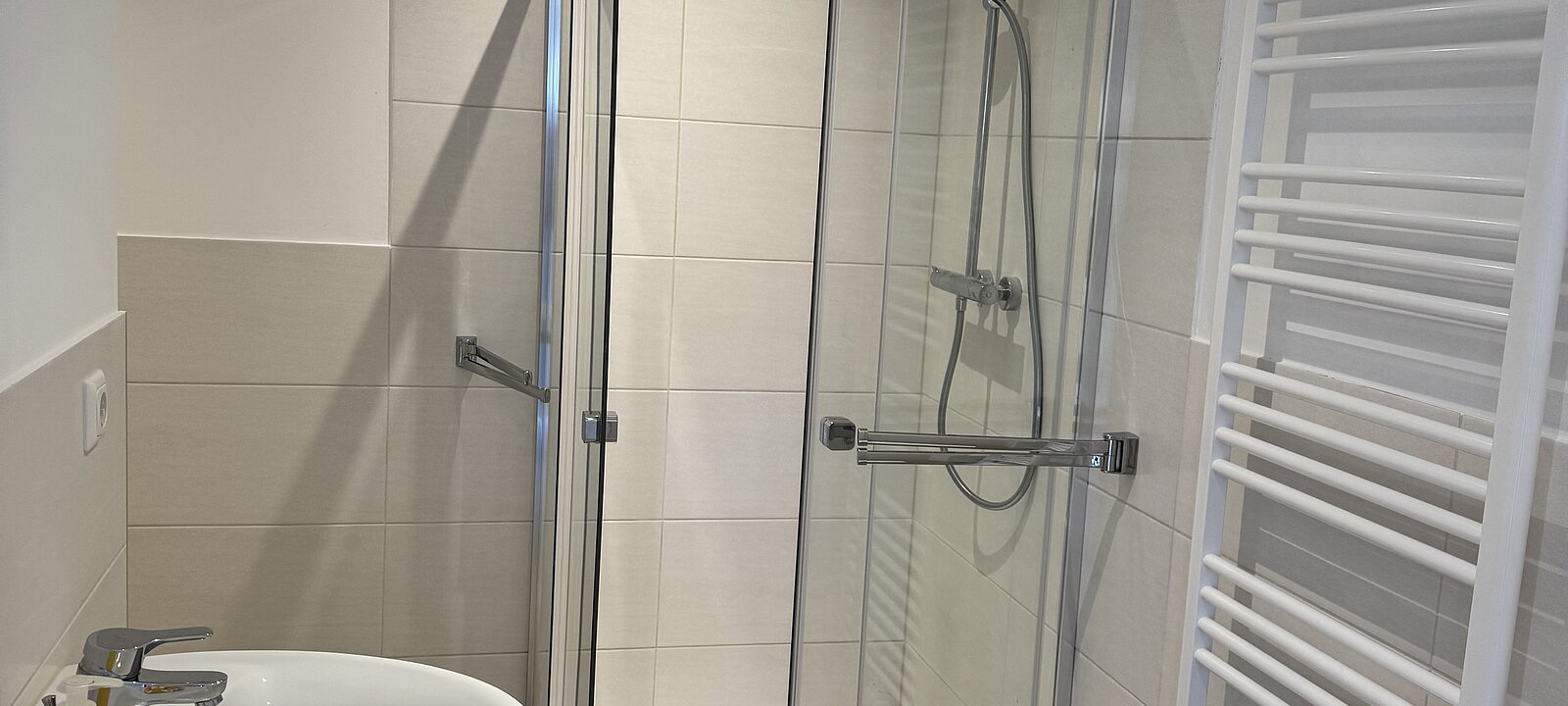 voll ausgestattetes, neues Badezimmer mit Abstellbereich bzw. Wasseranschluss (gegenüber der Dusche)