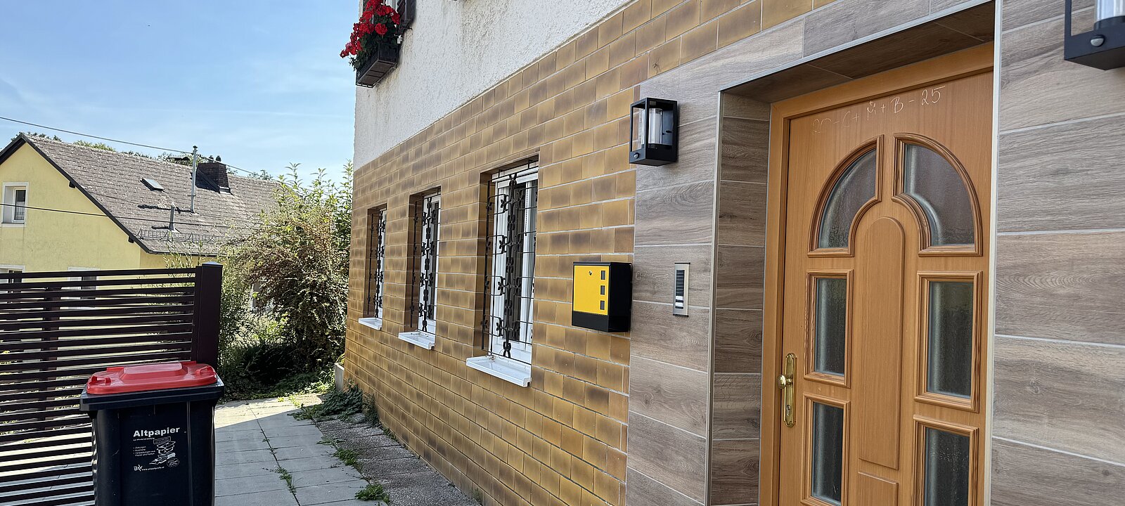 Neue Wippro Eingangstür mit 5fach Verriegelung, Terasse und Blick auf die steinparzerstrasse-seitigen Fenster