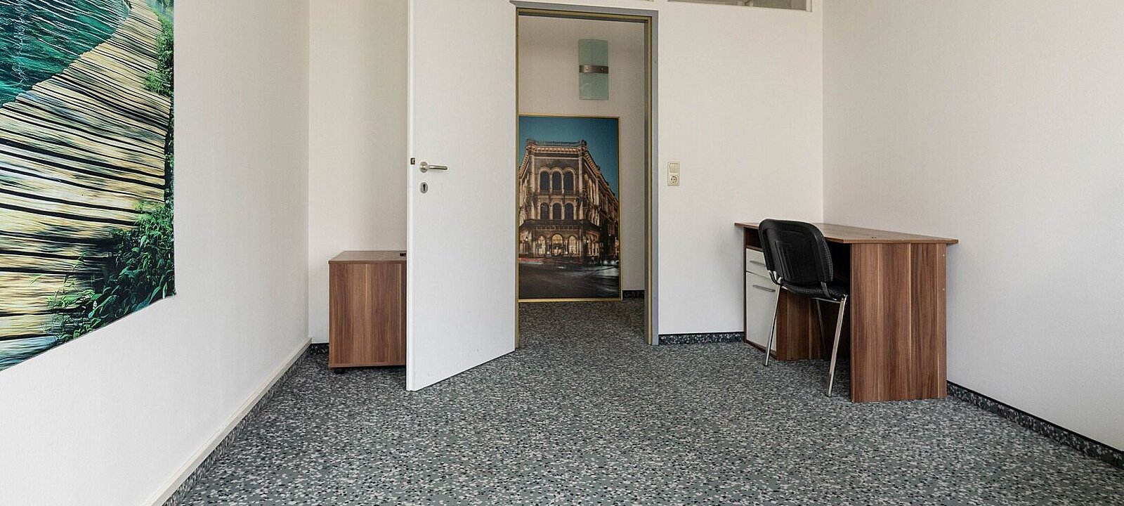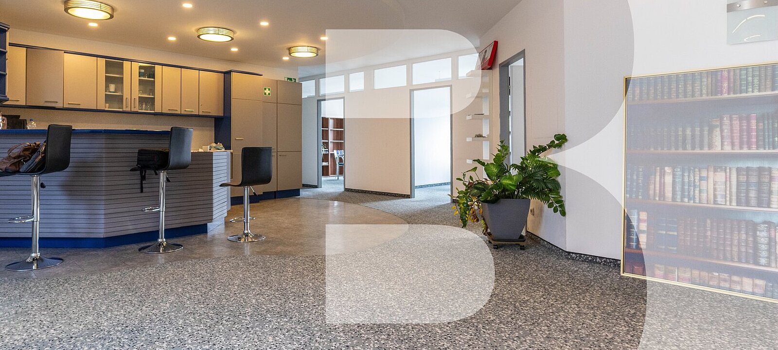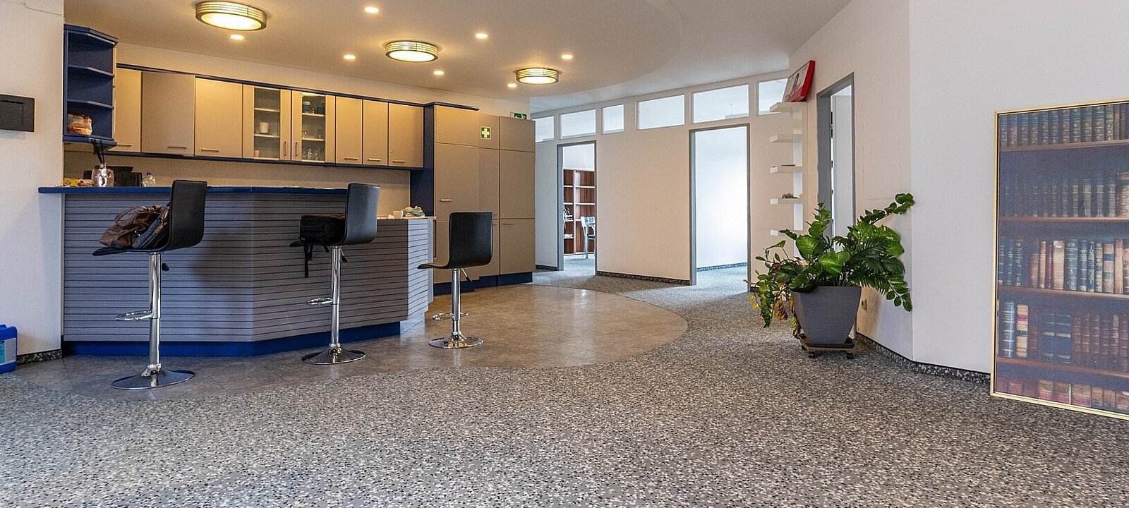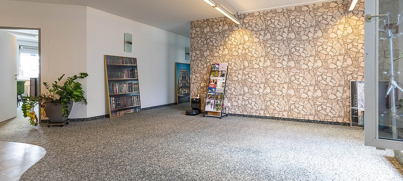 Schon beim Eintreten empfängt Sie ein weitläufiger Empfangsbereich – ideal, um Kundinnen und Kunden stilvoll willkommen zu heißen. Von hier aus gelangen Sie zentral in alle weiteren Räume sowie auf die überdachte Terrasse, die zusätzlichen Freiraum bietet.