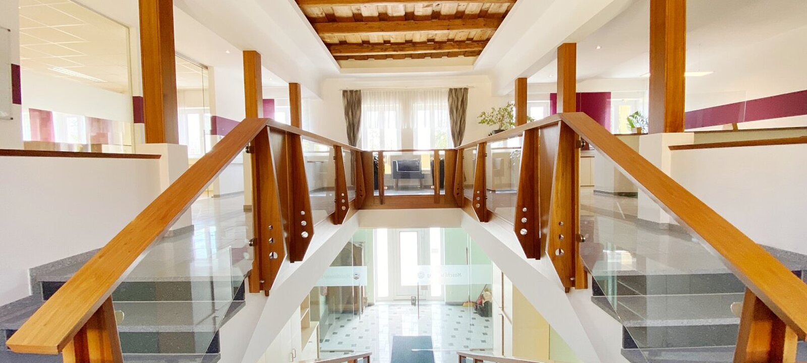 Diese Büroräumlichkeiten befinden sich im 1. Obergeschoss eines neuen, sehr imposanten Vierkanthofes und sind über einen großzügigen Eingangsbereich und eine breite Treppe erreichbar.