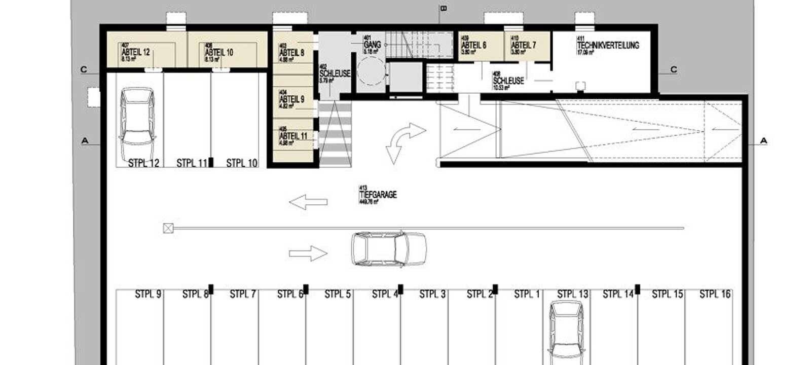 Mit insgesamt 16 Stellplätzen ist die Größe dieser modernen Tiefgarage sehr überschaubar und bietet eine helle und sichere Atmosphäre. Die Öffnung des TG-Tores erfolgt mittels Fernbedienung.