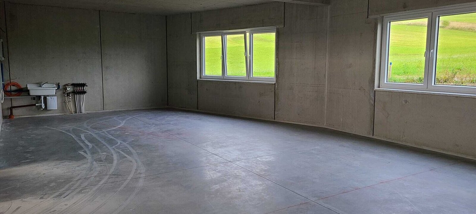 Das Erdgeschoss hat eine Grundfläche von 136m². Im hinteren Teil der Halle ist bereits eine stabile Betondecke eingezogen. Dieses Obergeschoss hat ca. 76m² und bietet einen hervorragenden Blick auf den Nordrand der Alpen.